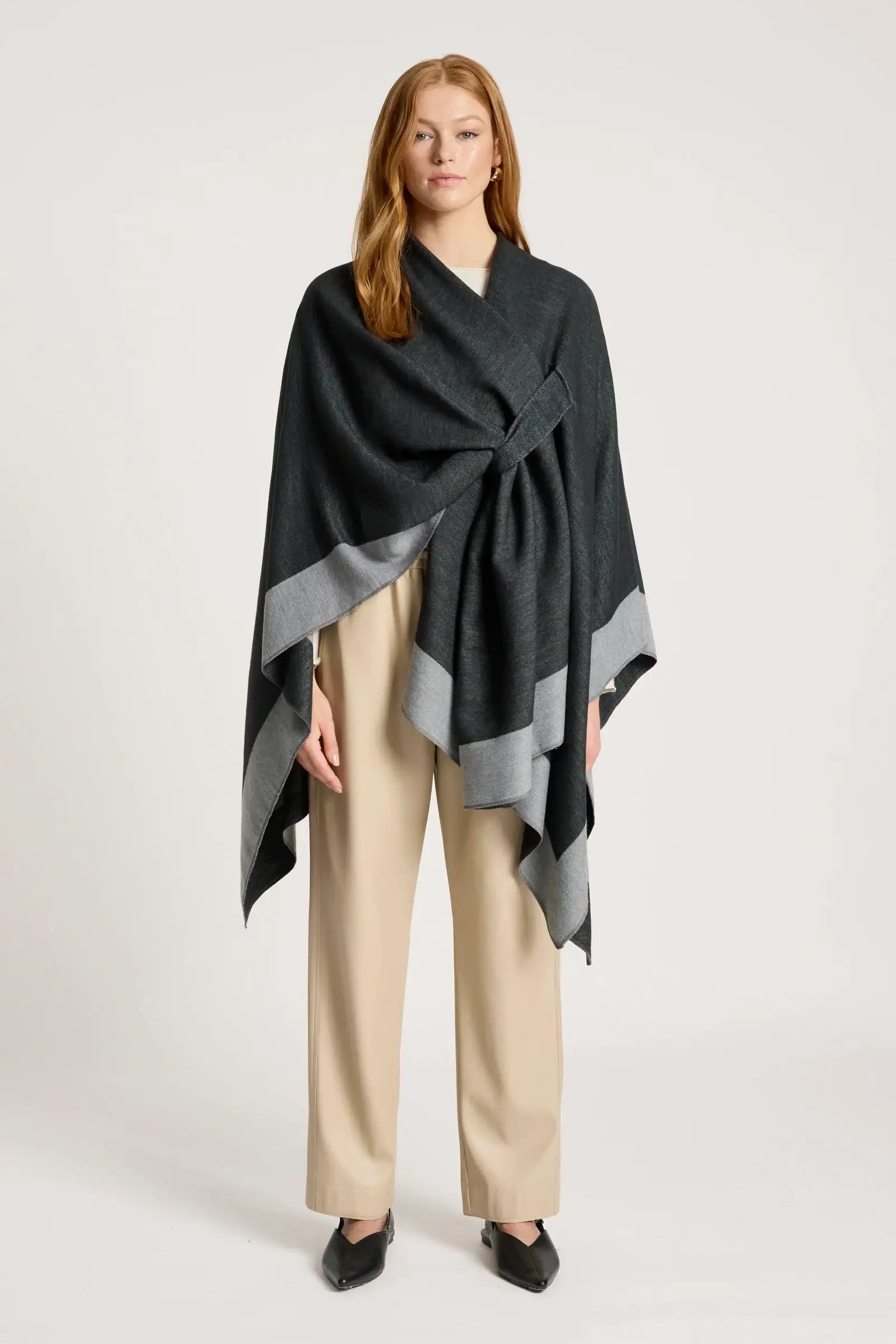 A unique, softly draped cape designed to add interest to everyday outfits. Featuring a reversible design with a subtle twist detail and loop fastening on one side, the Ayla Cape offers versatile styling and effortless layering.
