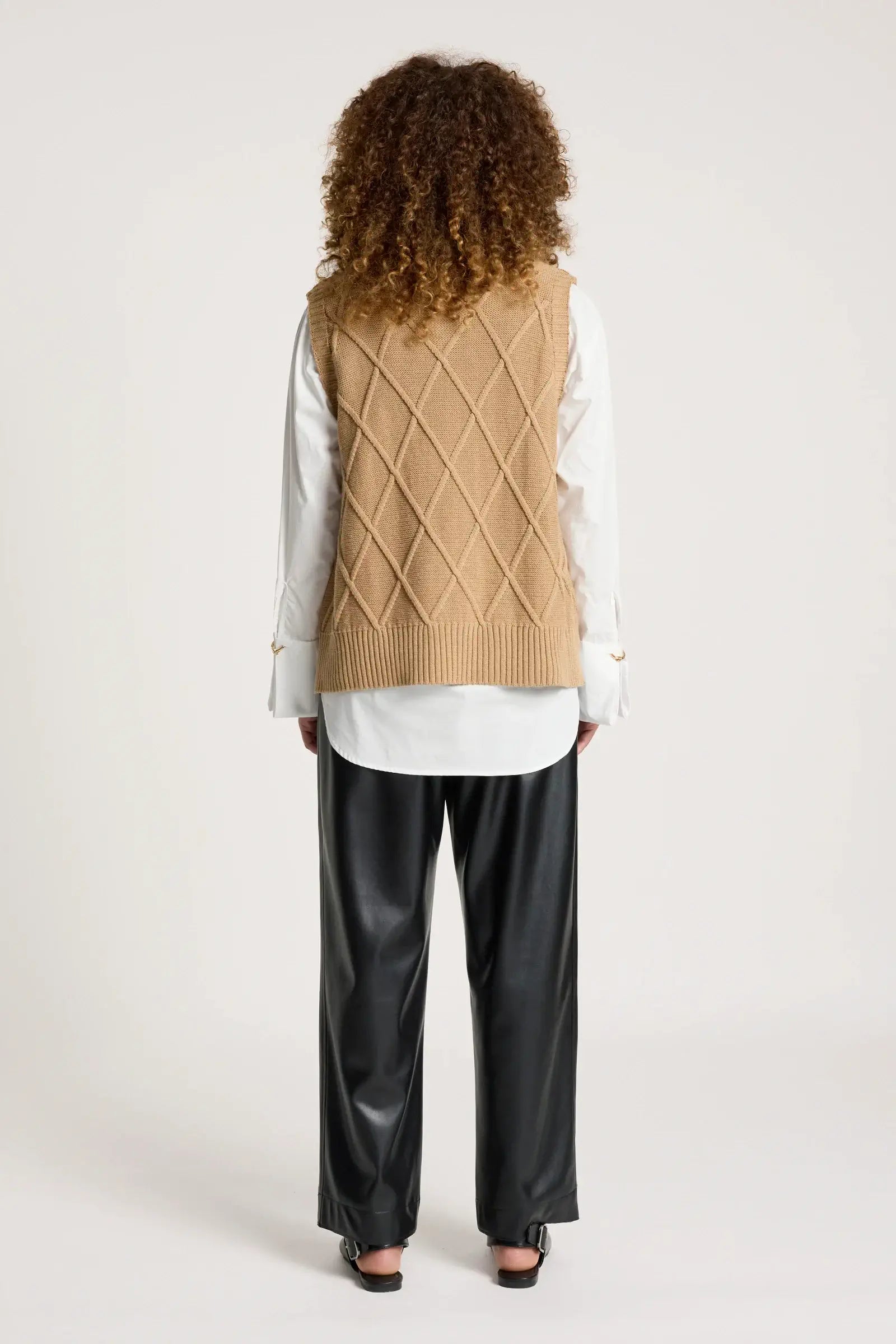 A classic V-neck knit vest with a modern twist. Crafted from breathable cotton, the Liora Knit Vest features a distinctive checkerboard knit and ribbed detailing. Designed for effortless layering, it adds depth and polish to everyday outfits.