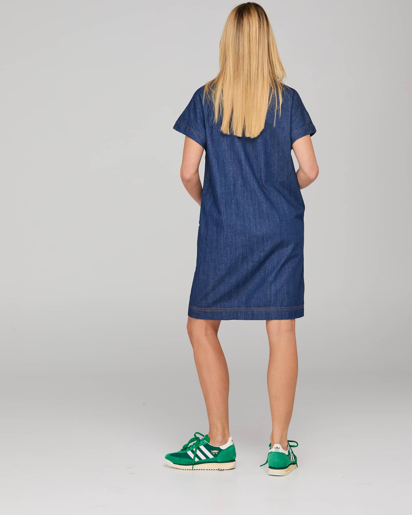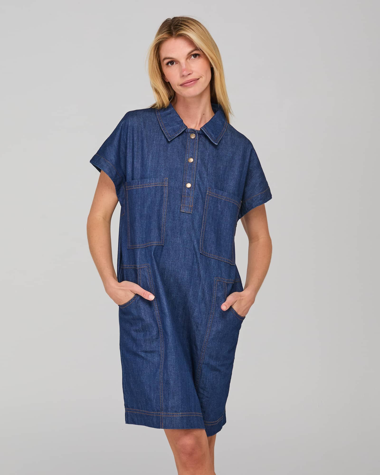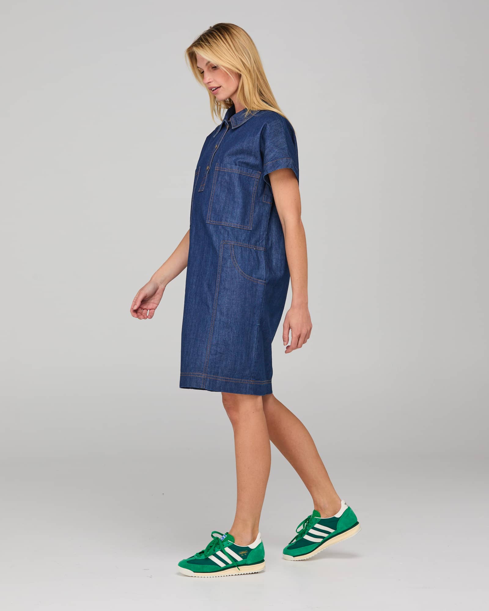The Boom Shankar Fumiko Dress is the perfect trans-seasonal piece in a luxe dark denim with classic contrast stitching and patch pocket detail.