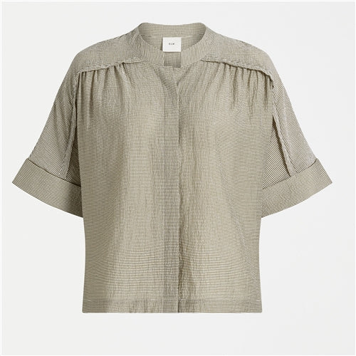 The Porta Shirt is a relaxed short sleeve top crafted from lightweight, specialty woven stripe modal blend with a subtle seersucker texture. Featuring a yoke detail across the front and back with soft gathers creating flattering interest. This elevated, everyday essential shirt has a band collar, concealed clean-look button-up placket and short, wide batwing sleeves. A versatile classic piece that can be dressed up or down, worn loose or tucked in. Style with our Hanning Skirt or Pant for a casual weekend look with our Olive Sorell Pant and gold Gild Cuff for a more refined elevated look.