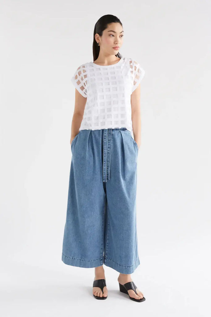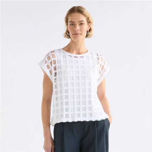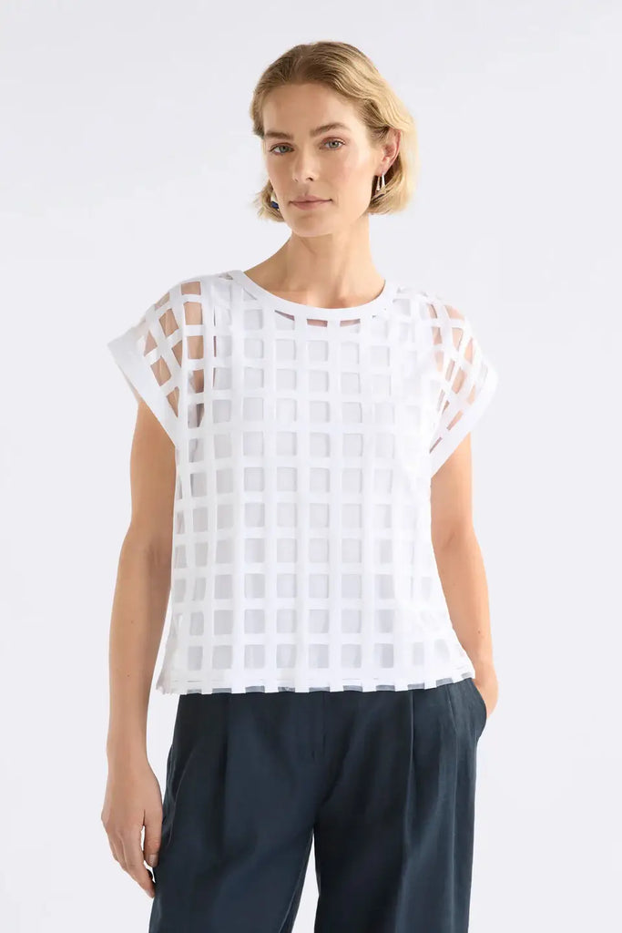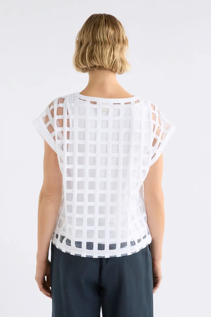 The Grid Burnout Top is a re-imagining of an ELK classic, reintroduced to grace wardrobes with its styling versatility, and day-to-night elegance. The top is accompanied by a scoop-neck singlet with wide straps. Lean into the geometric design of the burnout fabric by pairing with the grid patterns of the Lek Earring. Offered in versatile Olive and Fresh White.