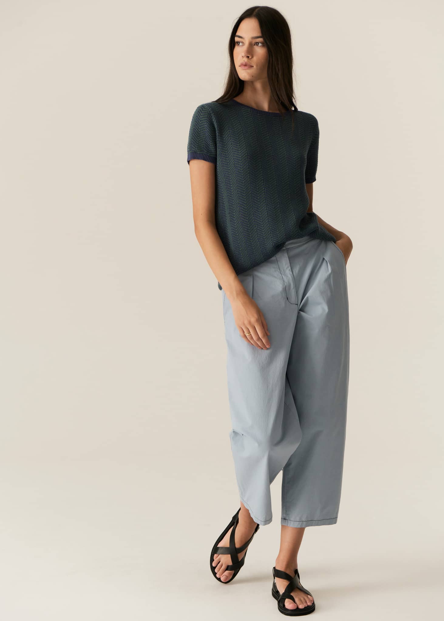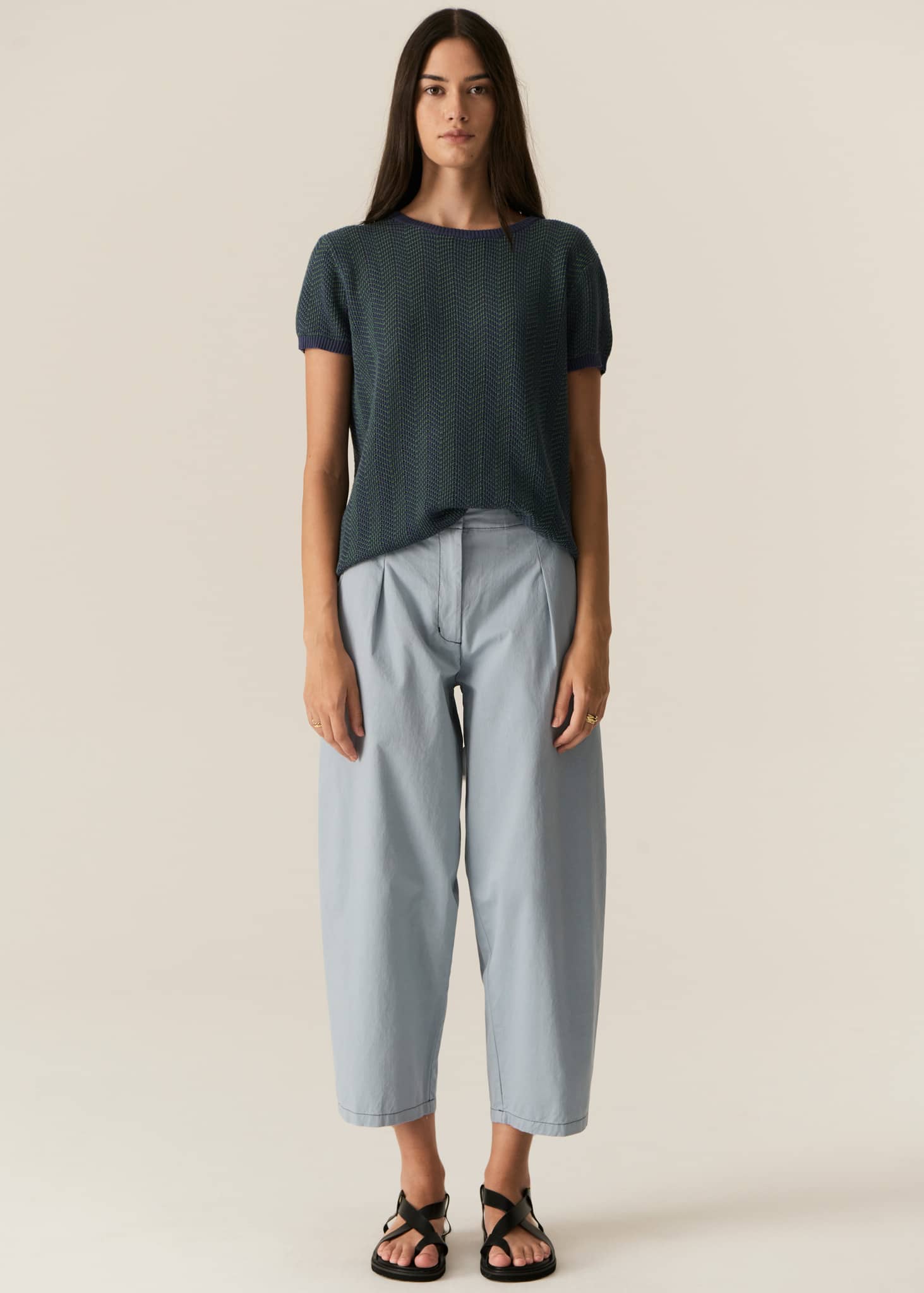 Made from a linen/Cotton blend with a cute zig-zag stitch, the Jules Knit Tee is a great alternative to a traditional t-shirt.