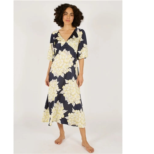 Our Traffic People Gloria dress is back in the gorgeous Navy and Cream Blooming Lovely Floral Print. A classic midi dress with a deep V neck gathering on the bust and beautiful 3/4 sleeves with elasticated cuffs. Perfect for the Spring wedding season.