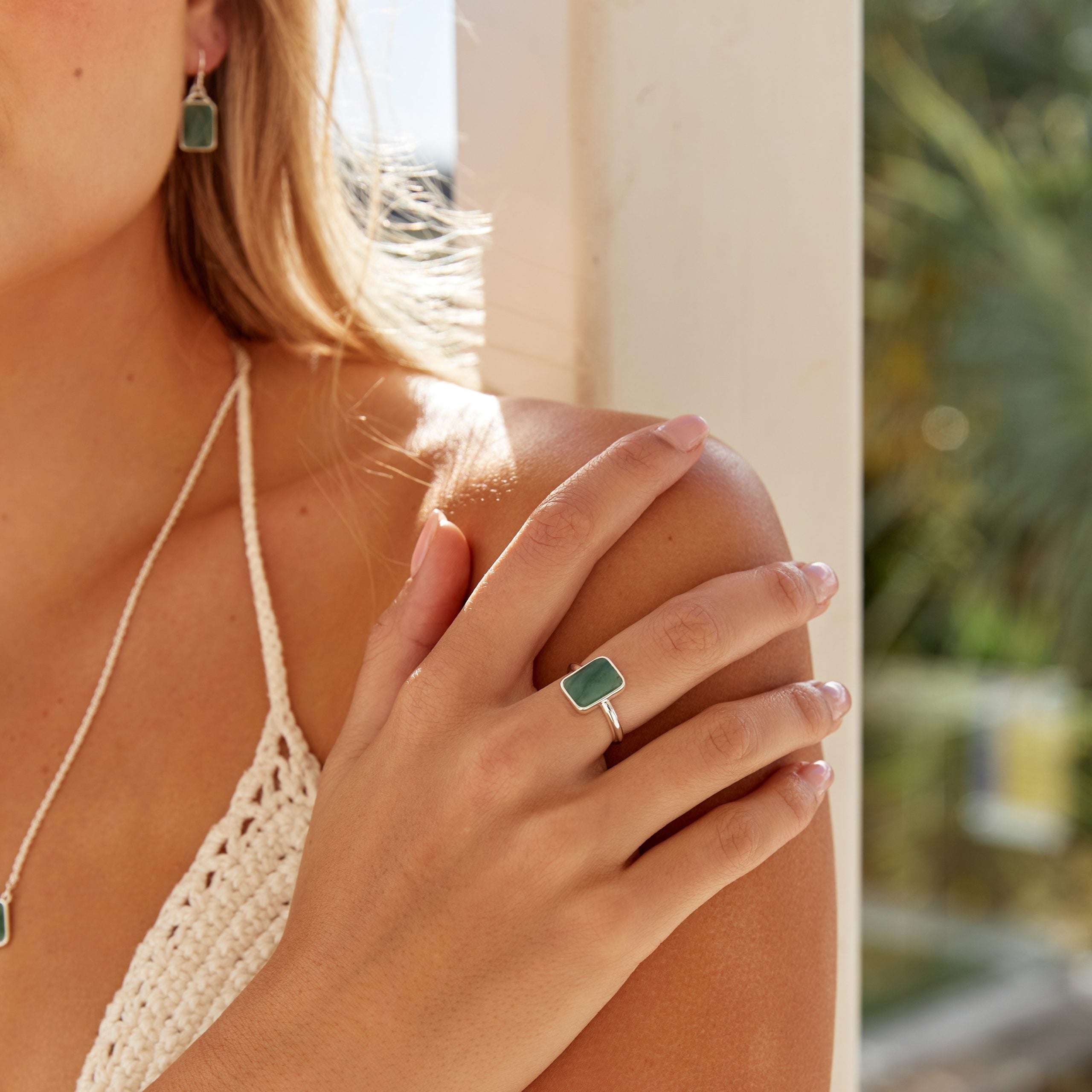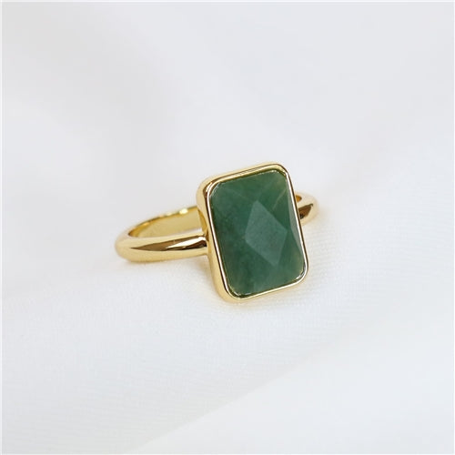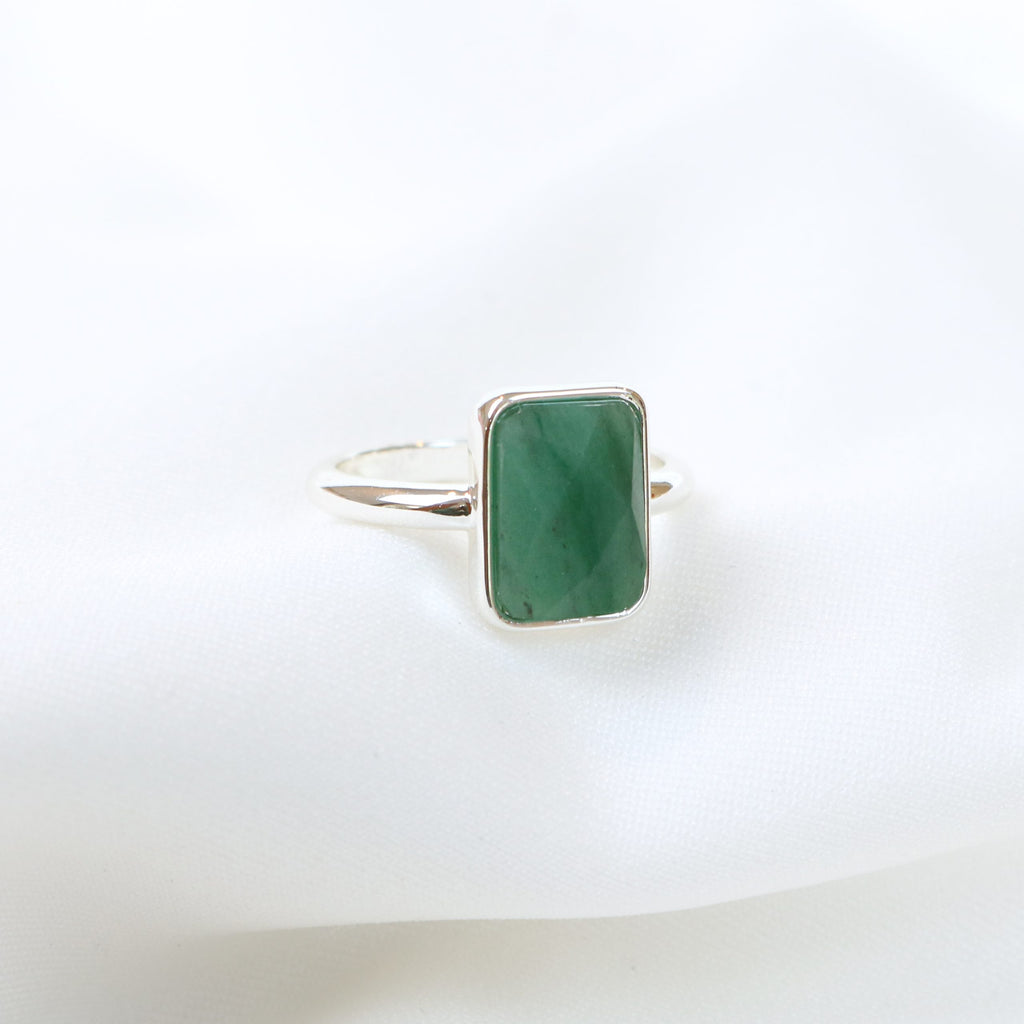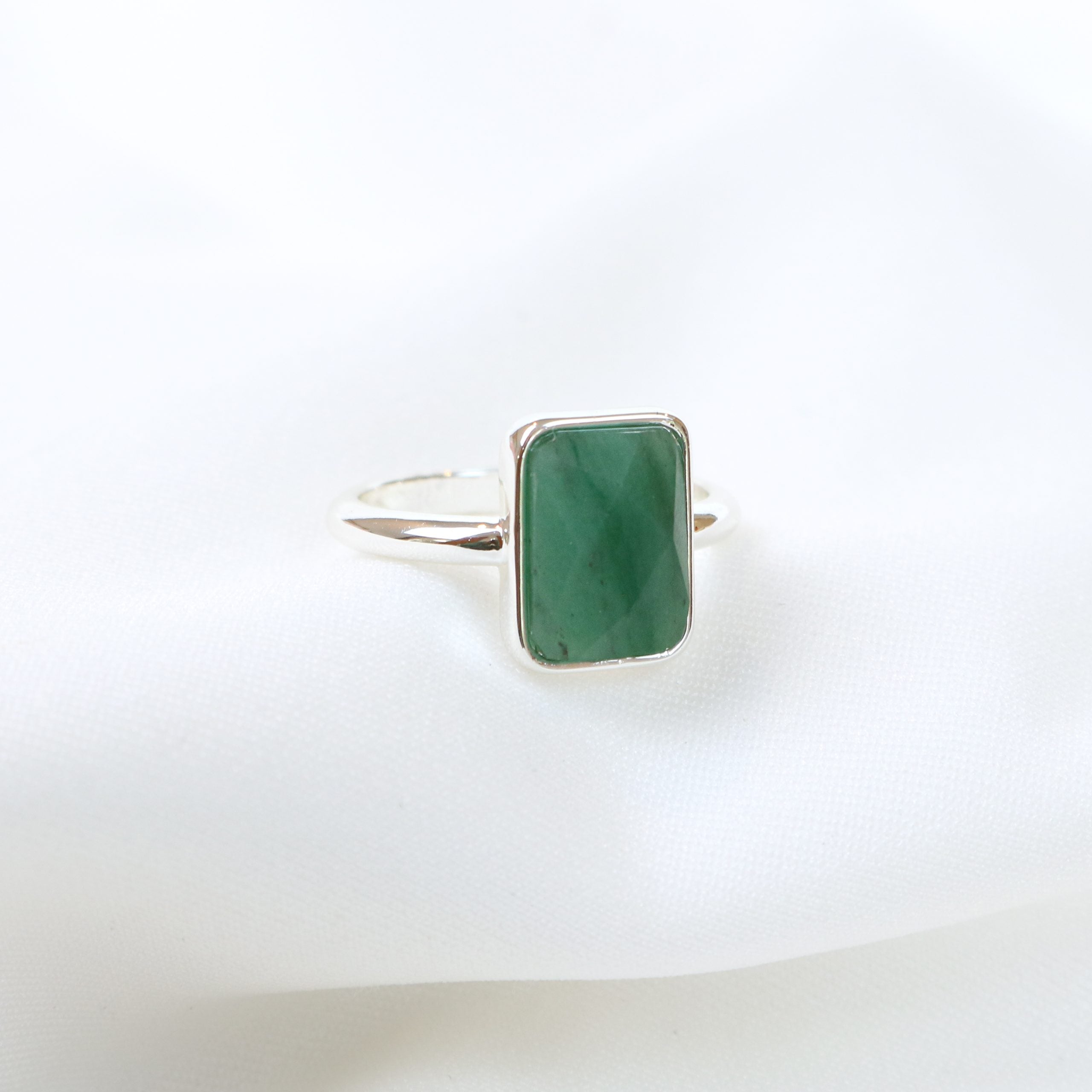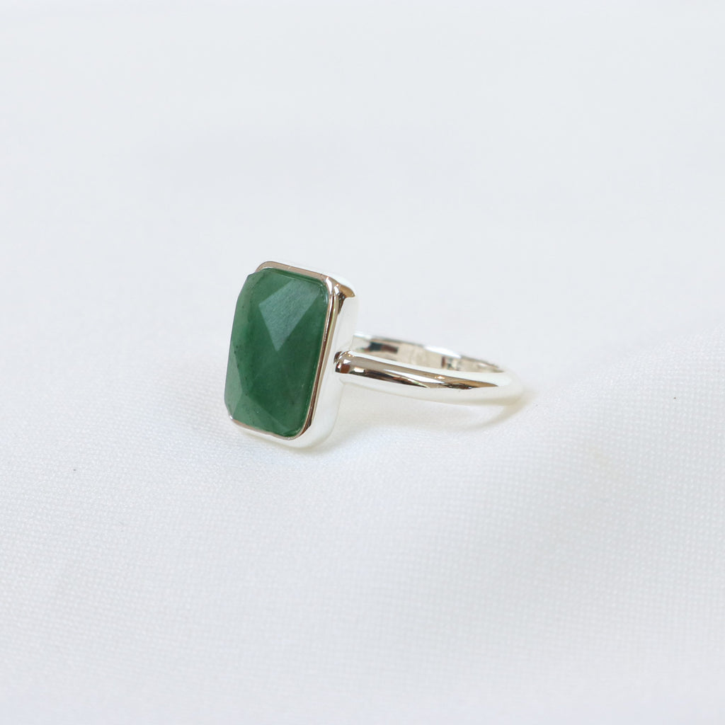Discover timeless elegance with the Jade Ring, a stunning piece from our Asteria collection. Crafted with a recycled sterling silver plated band or 18k Gold plated band and featuring a faceted African Jade stone, beautifully cut in a classic rectangular shape. Its simple yet sophisticated design exudes a vintage charm, making it a perfect accessory for any occasion. Embrace the allure of the ‘stone of dreams’ and let the Asteria Ring guide you through the realm of imagination, where visions of the past and hopes for the future intertwine.