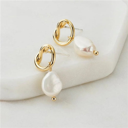 These earrings feature a freshwater pearl delicately hanging from a meticulously crafted gold knot, elegantly attached to a stylish stud. The intricate gold knot adds a touch of sophistication and refinement to the overall design.
