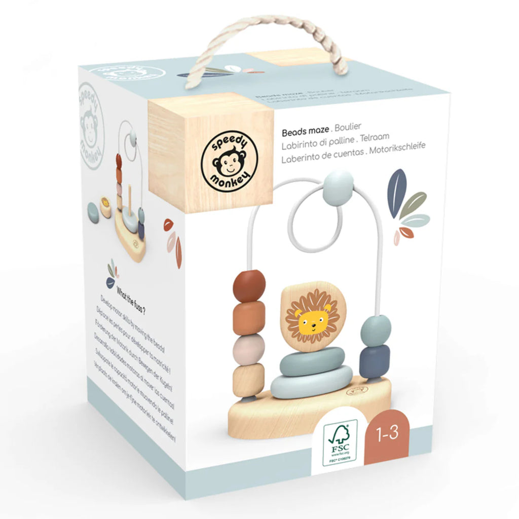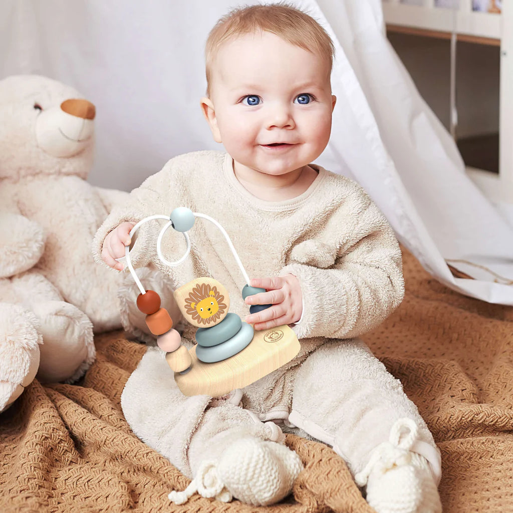 Play with your lion friend, king of the bead maze! Little hands can move the soft coloured beads over, under and across the wire bead frame as they go. This toy encourages dexterity, hand/eye coordination and colour recognition as toddlers guide the 7 beads from one side of the frame to the other. This toy is crafted from sustainably sourced wood from FSC® certified forests and coated with non toxic paint.