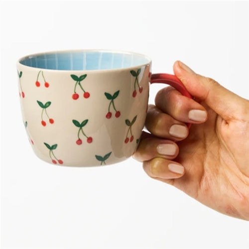 Light blue stripes hug the interior of this hand-cast mug, while the phrase "Mon Cherie" waits at the bottom a small endearment between you and your morning brew. The vibrant red handle and hand-painted cherries on the exterior creates a playful contrast that speaks to our Sydney design teams love of thoughtful colour combinations and the skill of our Vietnamese artisans.Dimensions