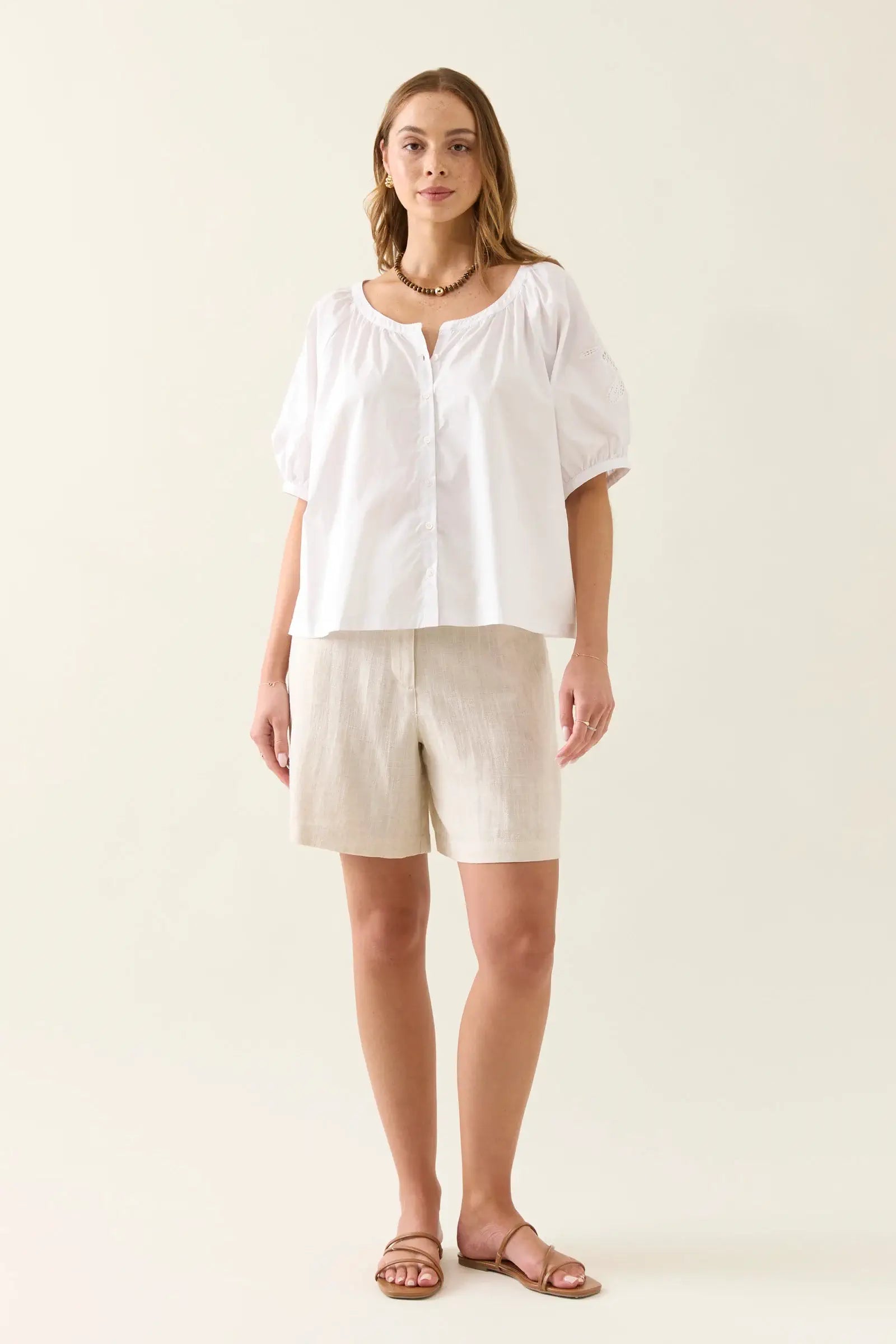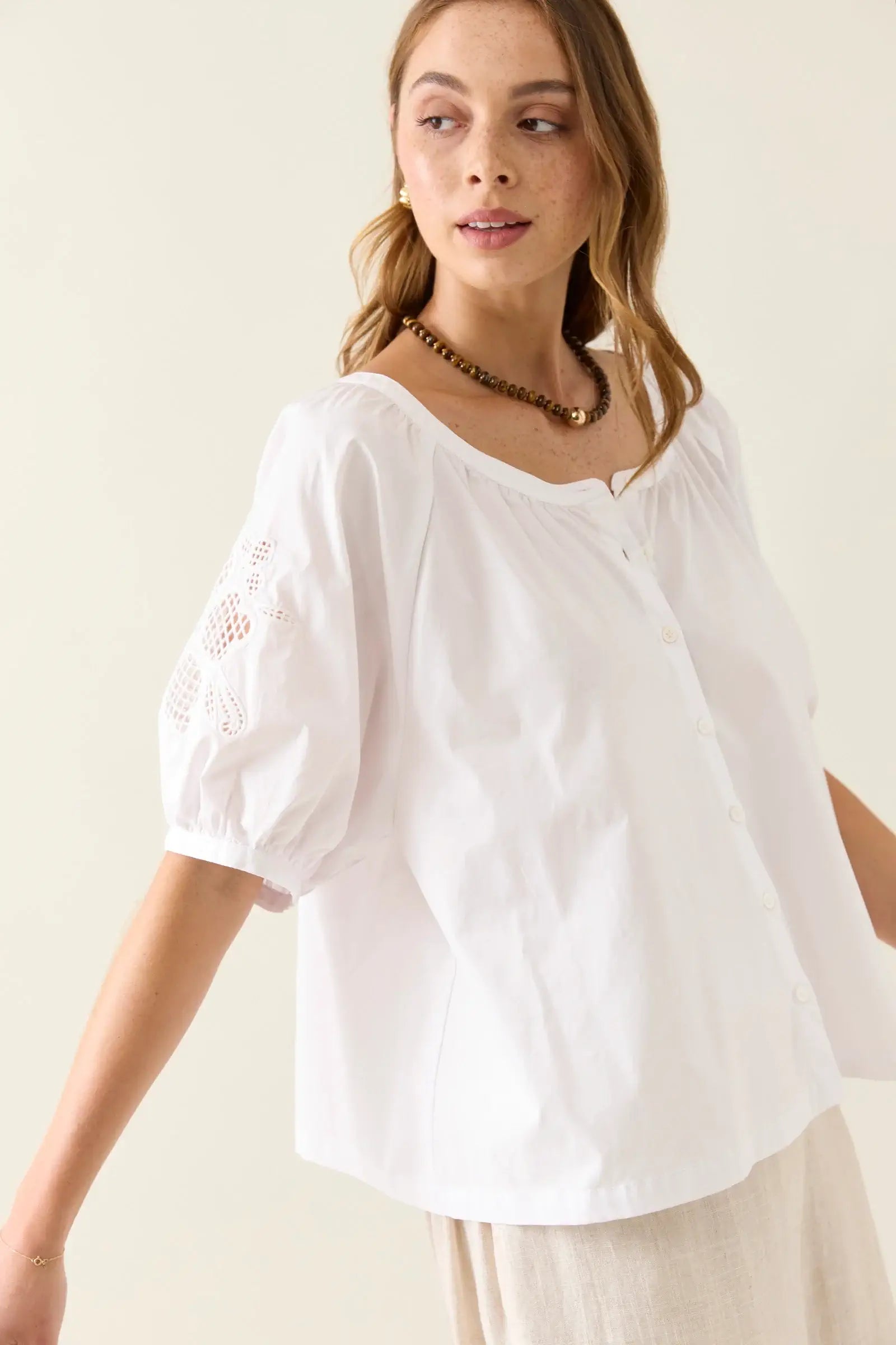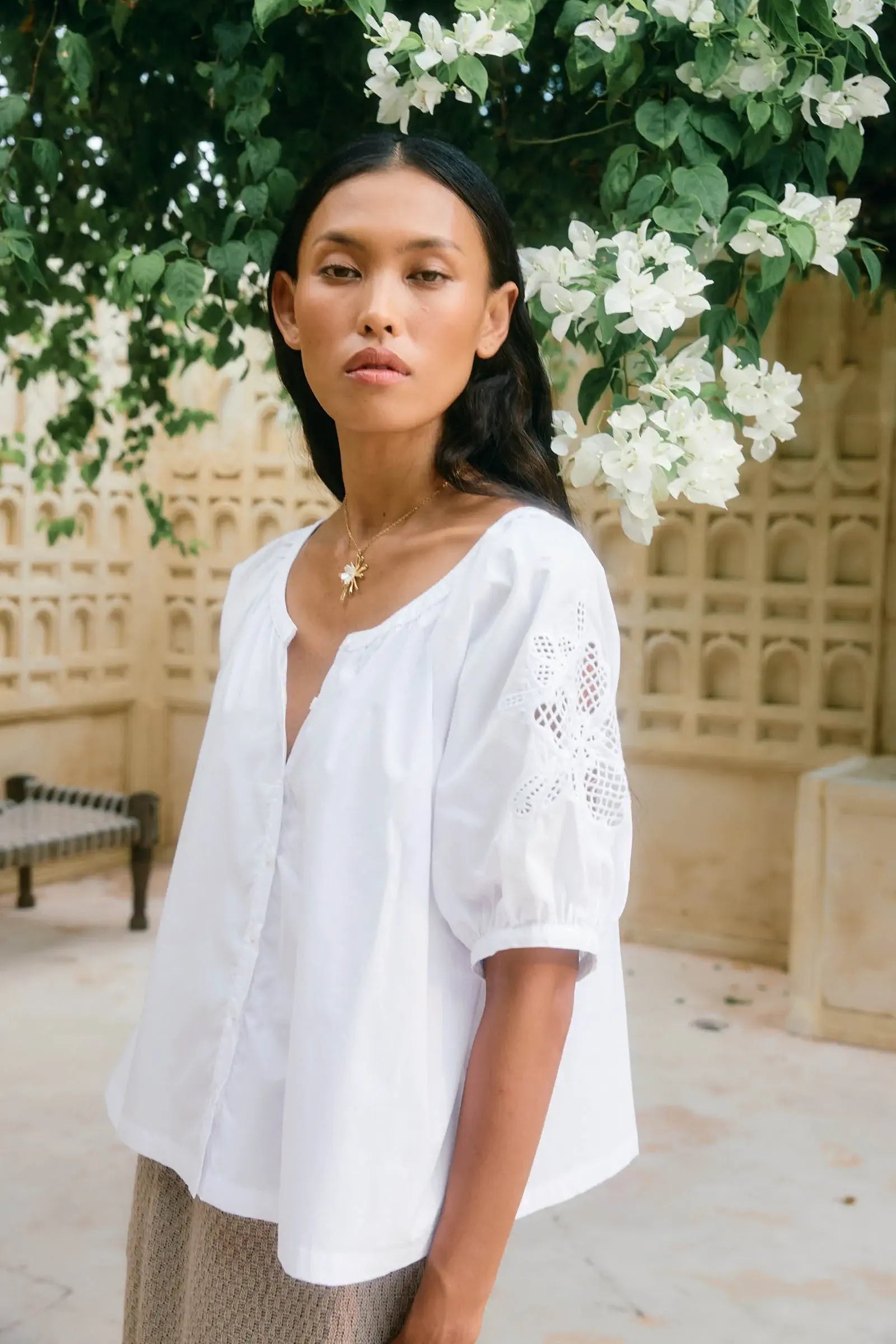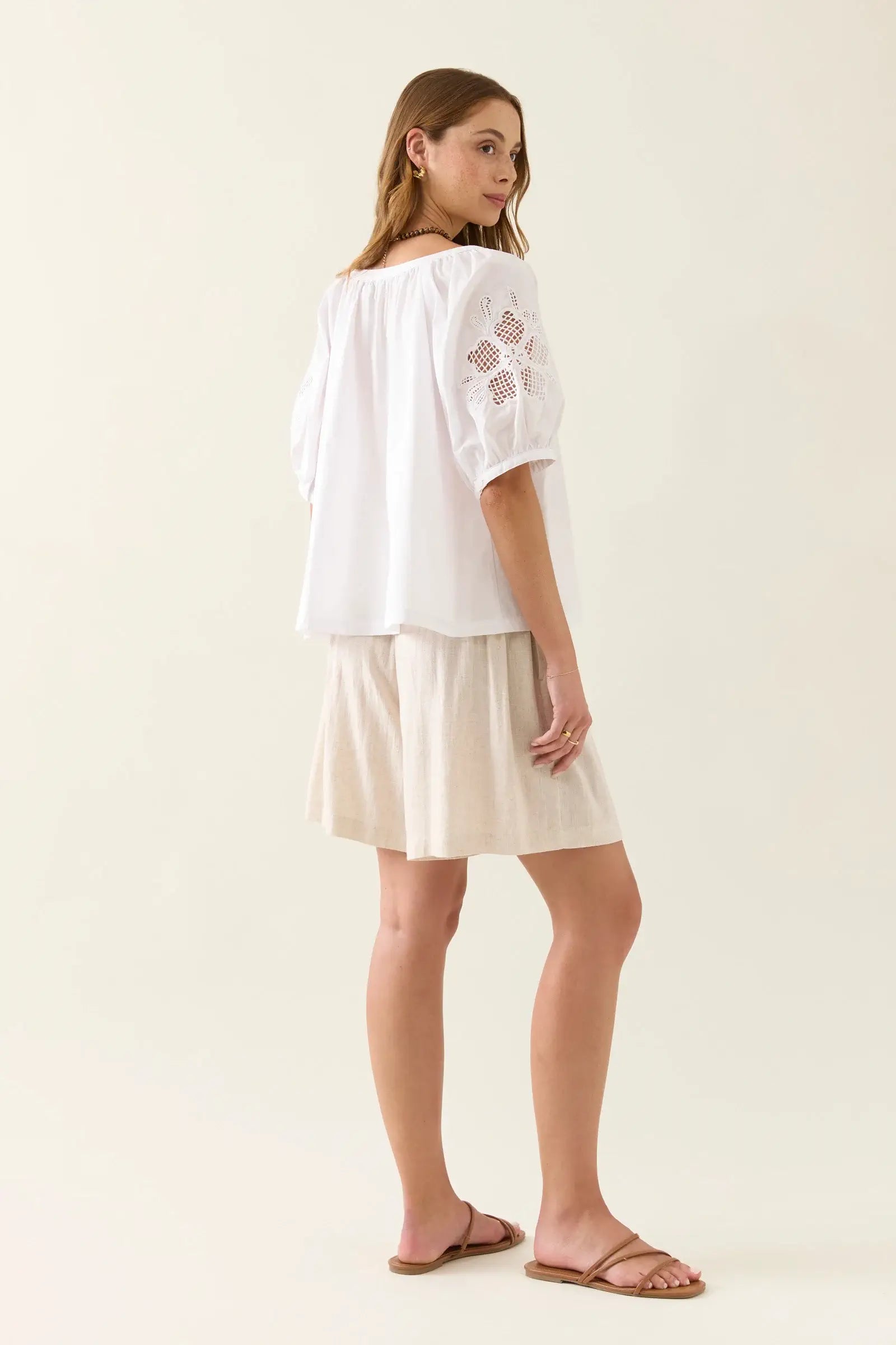 Crisp cotton poplin meets delicate cutwork embroidery in the Nilsa Button Top. Featuring a button-through front and softly puffed short sleeves, this charming piece reveals just a hint of skin through its intricate embroidered details.