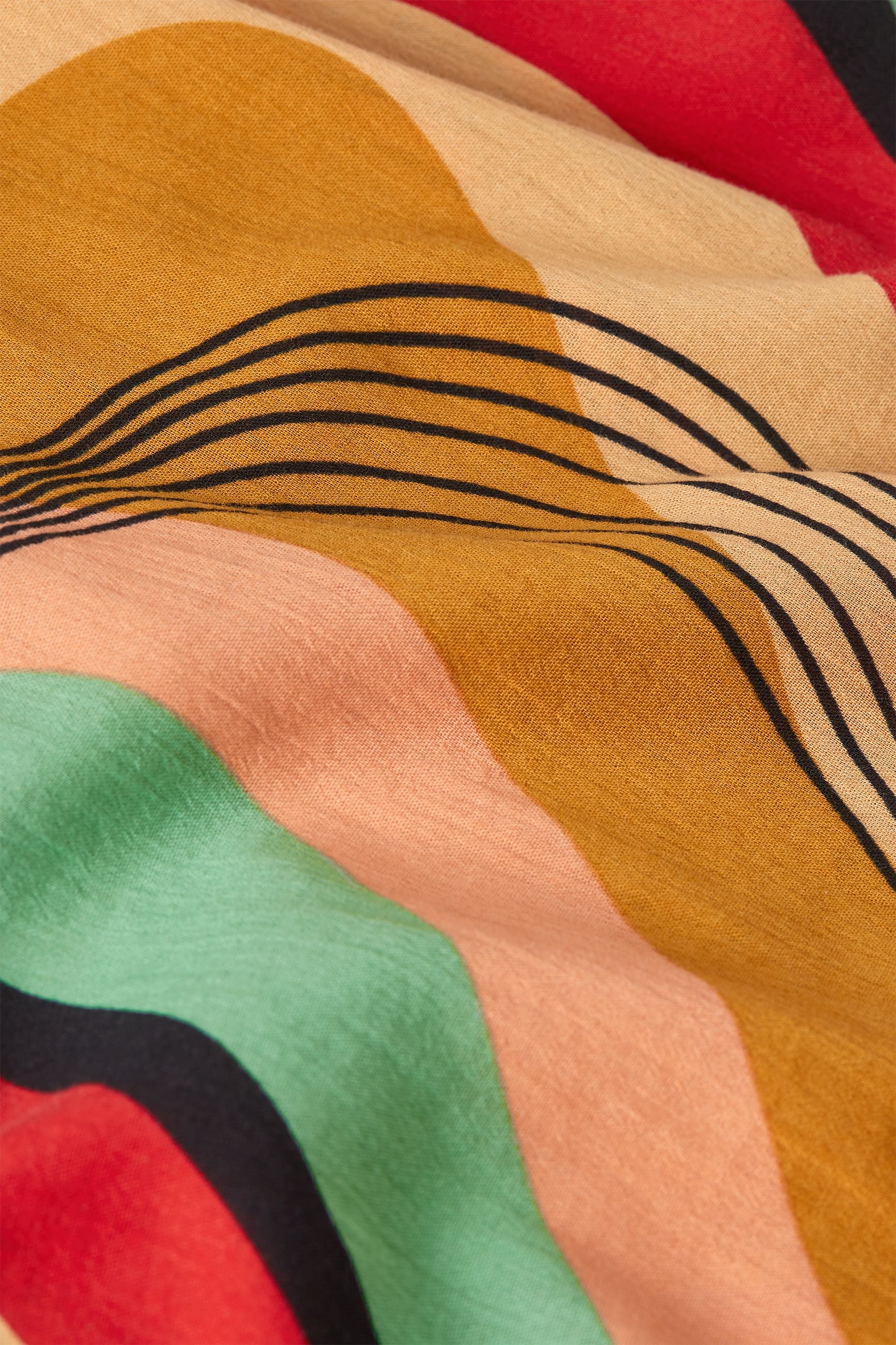A vibrant multi-colored print and flowing silhouette create effortless style, while the tie belt and button closure add playful detail.