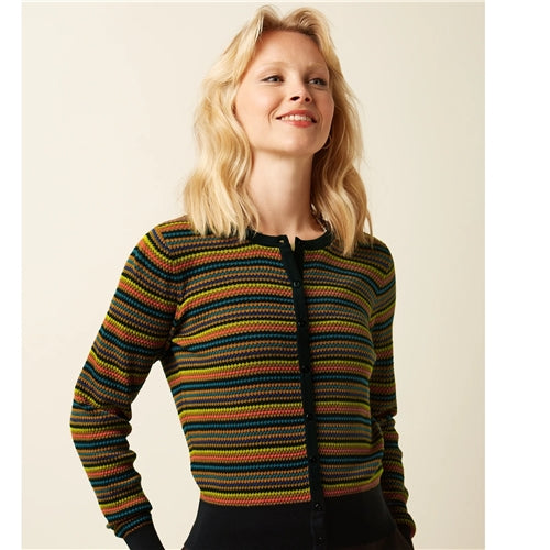 The Frio roundneck cardigan offers cozy comfort with its stretchy cotton knit and ribbed cuffs. Featuring long sleeves, a round neckline, and a button closure, finished with a striking graphic pattern – a versatile addition to your wardrobe.