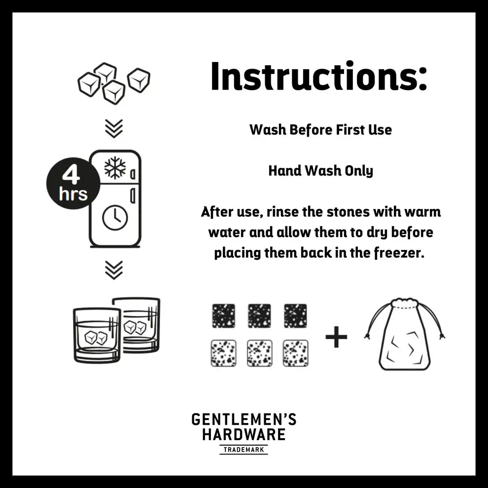 Chill your drink without dilution, the Gentlemen's Hardware Whisky Stones are ideal for any ice cold drink lover. Practical and stylish, the phrase 'on the rocks' is brought to life with this set of six stones made from granite and soapstone. Simply pop in the freezer four hours before use, then when you wish to chill your drink, use as you would ice cubes. An innovative and unique design, ideal for travelling and any ice cold nightcap. Perfection chilled! Hand wash only. Set of 6 individual stones with fabric branded storage pouch.