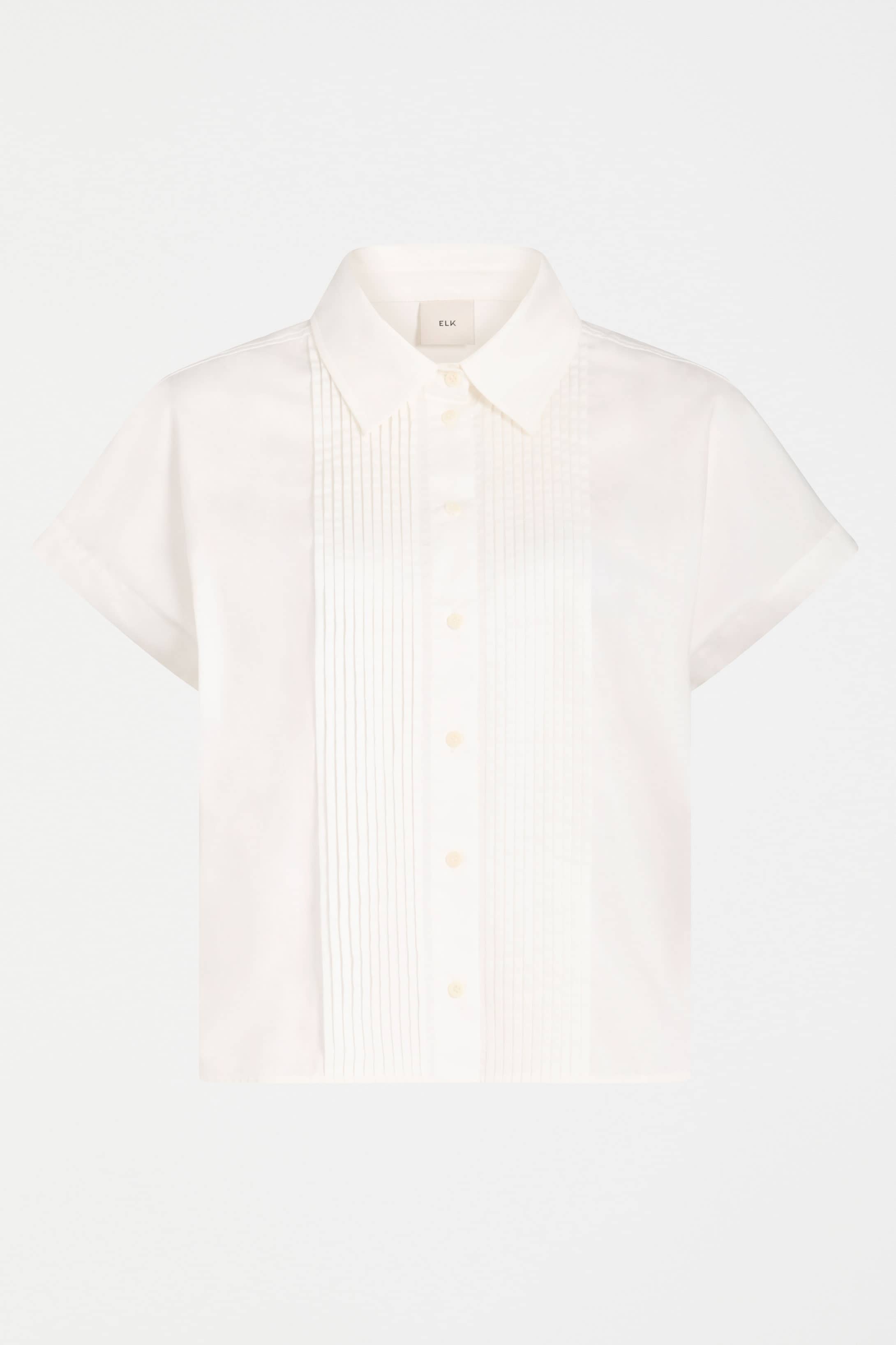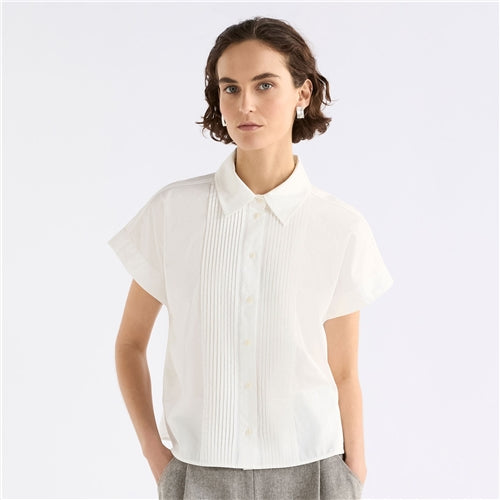 The Apres Shirt showcases relaxed tailoring in 100% organic cotton. This slightly cropped, capped sleeve shirt features intricate front pleats, adding interest, texture and definition. The short, capped sleeves give this style a sleek feminine silhouette. Pair this button up short sleeve shirt with tailored pants, shorts or skirts. Style with our Citte Pant for a modern desk to dinner outfit