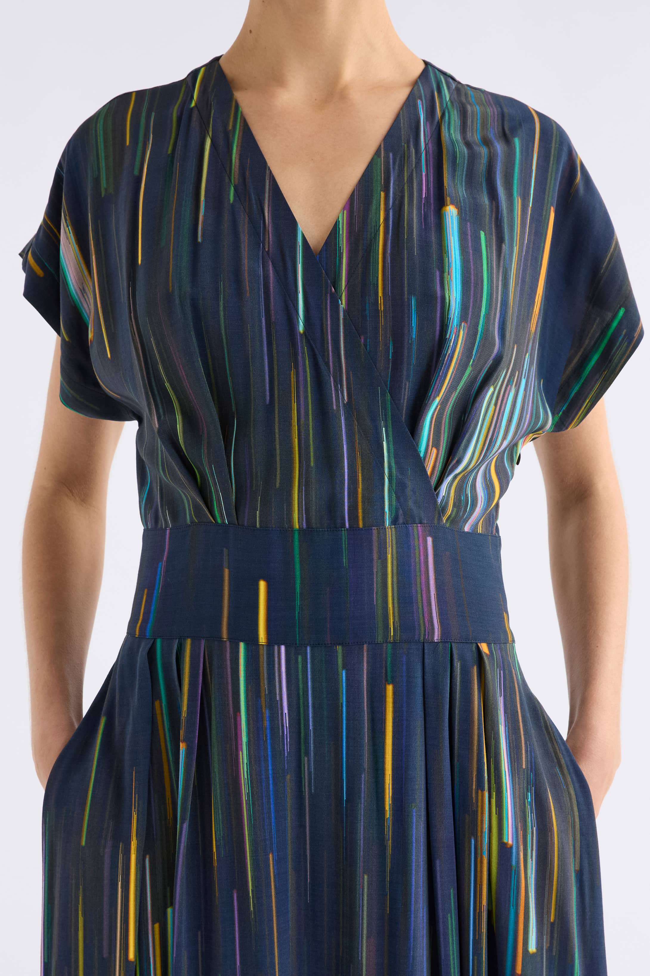 Crossover v-neck style -Batwing sleeve (underarm sits low) -tucks under bust at waist seam -wide fitted waist band with elastic at back for comfort fit -Invisible Side zip opening -tucks on Front of skirt for volume -Midi Length -Yardage Print, placement of Print will vary on Each item