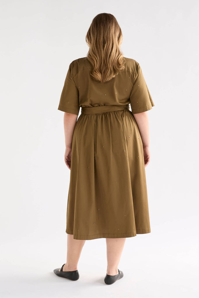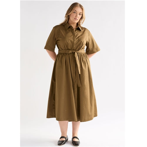 The Stuud Long Shirt Dress features distinctive all-over metallic studs, adding interest and a little edge to this thoughtful design. A regular fit upper body that flows into A-line hem that gathers at the waist. This midi dress has a classic shirt collar with button-through placket and is crafted from organically-grown cotton with a smooth structured finish with a soft yet polished appeal