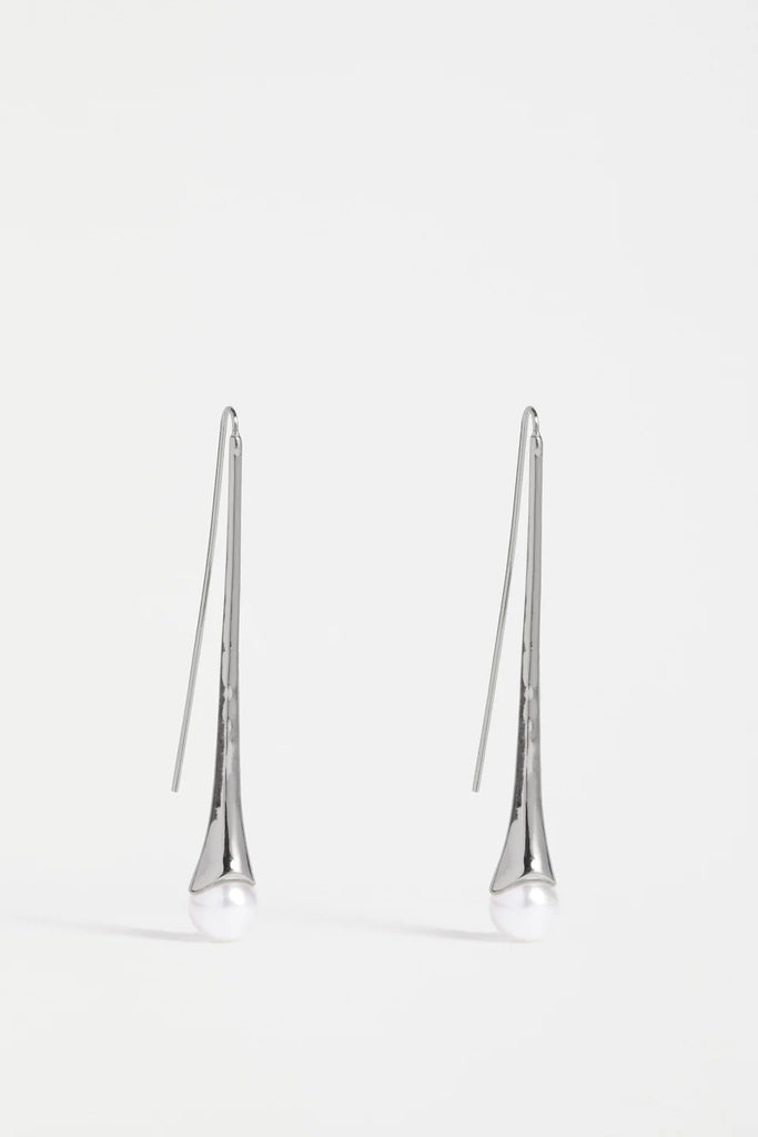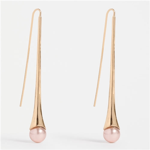 Long hook earring style comprising of a slender cylindrical stem with a Faux pearl bead attached under stem -Lightweight sculptural style in Classic Gold and Gunmetal in a shiny metal finish -Faux pearls are dyed a complimentary colour to their metal base