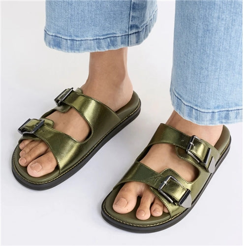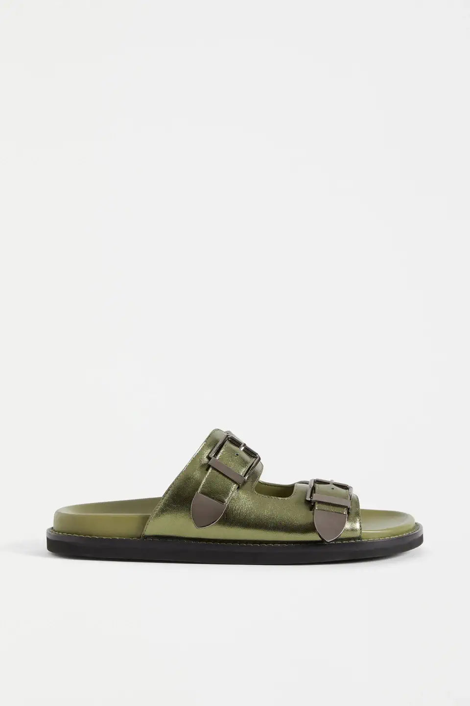 The Spenne Sandal is a classic, buckled slide style available in two rich metallic colourways. Featuring tonal, shiny western inspired hardware and foiled leather construction. The dual buckled strap feature allows for maximum adjustability while the moulded footbed ensures all-day comfort, making this sandal a fun, easy addition to summer outfits.