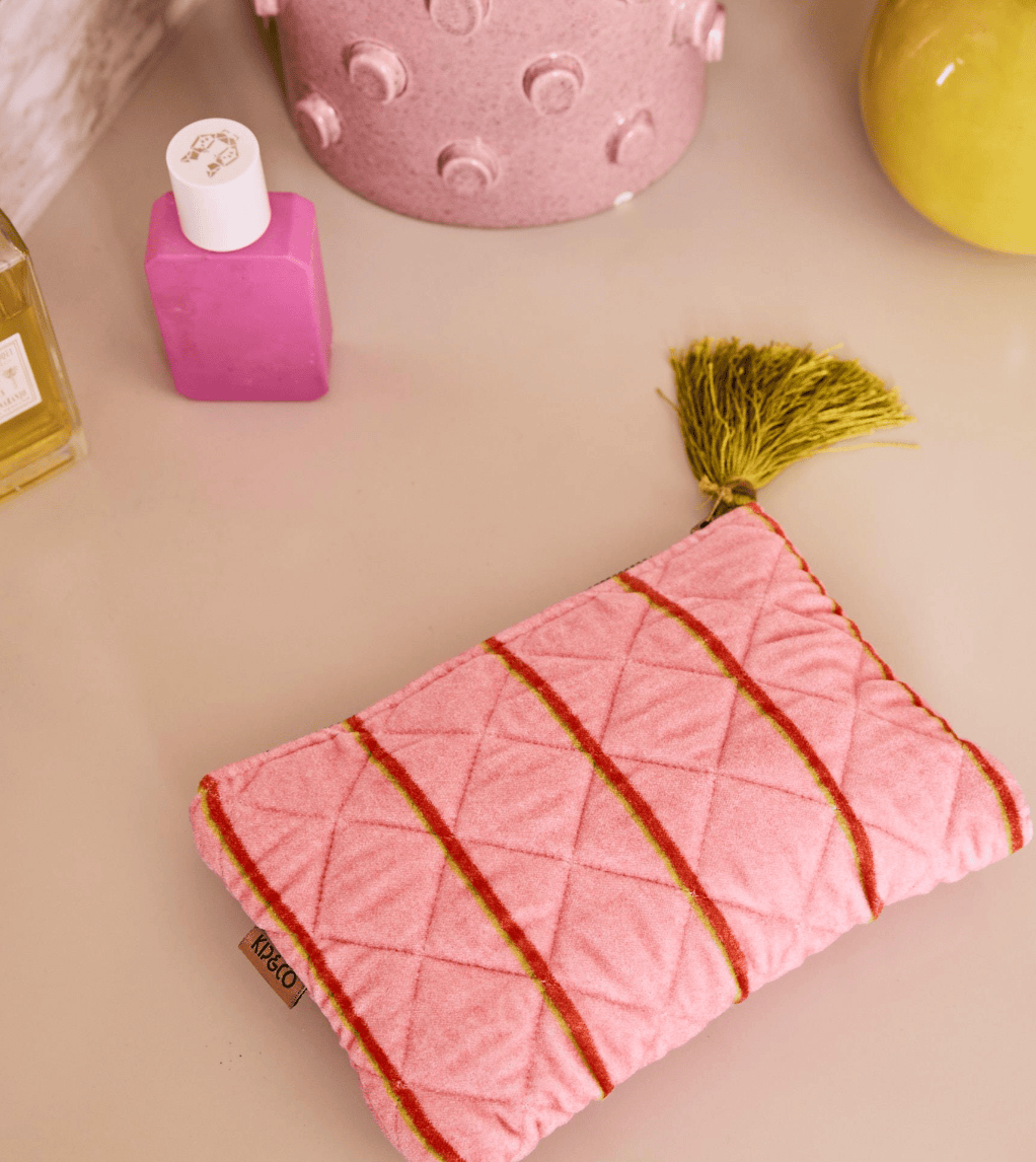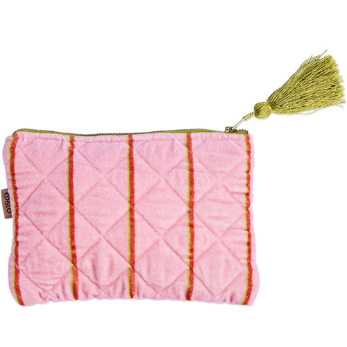 Quilted velvet cosmetics purse with zip closure and feature tassel.
