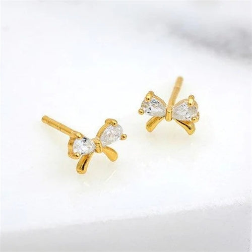 A petite 925 sterling silver stud in the shape of a bow with CZ crystal detail. These studs are designed to adorn your ear and create the perfect stack. The Riley Stud Earrings are all about adding a touch of sweetness and elegance to your style. The dainty bow shape, combined with the sparkling CZ crystals, brings a sense of charm and glamour to your look.